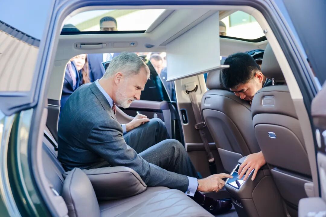 張建勇向費利佩六世重點介紹了享界 S9T的智駕系統、自動泊車功能和零重力座椅等。得知享界 S9T配備智能投影巨幕系統2.0,費利佩六世特意坐到后排進行體驗。